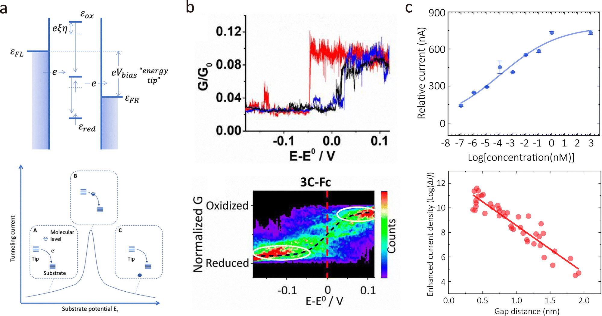 | Fig. 20 (a) Schematic energy diagram of redox active molecule set between tunnelling electrodes with a potential difference of Vbias (top). The tunnelling current/overpotential relationship. The significant current enhancement can be observed when the molecular energy level is set between the tip and substrate (below). (b) Experimental (top) and simulated (below) conductance vs. overpotential plot of 3C-Fc single molecule junction. Two distinct conductance distributions can be observed through the scanning, indicating the switching between the redox state of the ferrocene. (c) Concentration (top) and gap distance (below) relationship with tunnelling current of ferrocyanide/ferricyanide redox active couple measured through quantum mechanical tunnelling probes. Panel (a) is reprinted with permission from ref. 228, Copyright (2023), Royal Society of Chemistry. Panel (b) is reprinted with permission from ref. 235, Copyright (2019), National Academy of Sciences. Panel (c) is reprinted with permission from ref. 237, Copyright (2025), Wiley-VCH Verlag GmbH & Co. KGaA, Weinheim. | ||