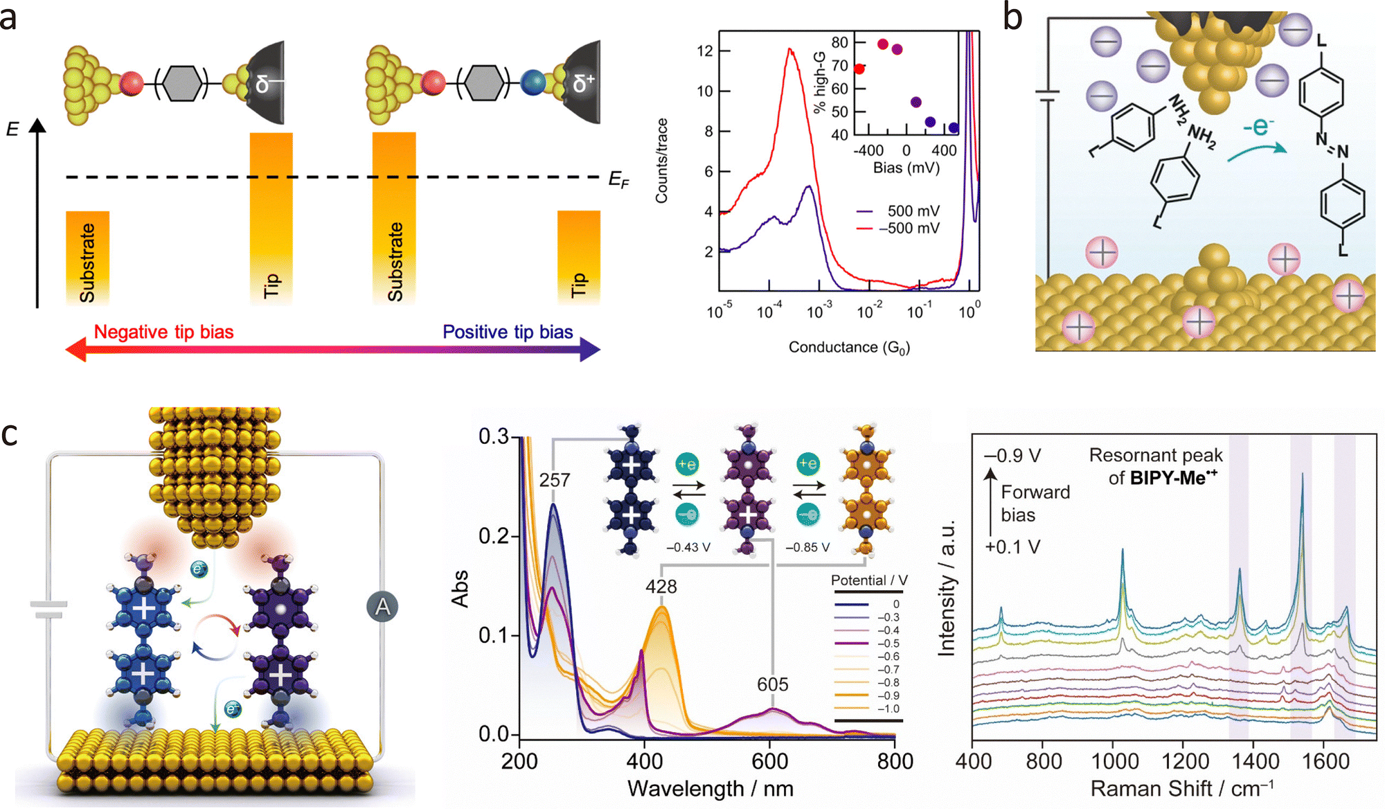 In contrast, at higher bias potentials, electron transport enters the field-emission regime. High-energy electrons can access unoccupied molecular orbitals, promoting the molecule to a higher electronic state.226 These high-energy electrons can interfere with aromaticity, alter reactivity, and drive chemical transformations relevant to electrocatalysis and photocatalysis.227 This high-energy regime provides a conceptual and experimental bridge between single-molecule reactions and catalytic processes, enabling the exploration of catalytic mechanisms at molecular-level resolution.216
