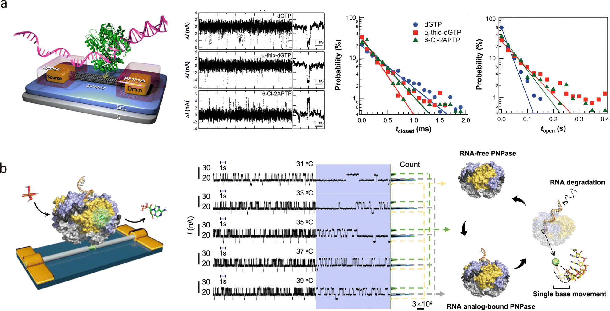 Similarly, Yang et al. used a silicon nanowire field-effect transistor (SiNW FET) to analyse in real time the dynamic mechanism of RNA analogue degradation by Escherichia coli multinucleotide phosphorylase (PNPase).281Fig. 29(b) demonstrates the configuration of a single PNPase junction. A single PNPase molecule was conjugated to the molecular bridge on the surface of the SiNW through a thiol–maleimide–Michael addition. Upon introducing RNA analogues, a distinct conductance shift was observed, followed by third-order conductance fluctuations after phosphate addition. They assigned the middle and low-conductance states to the PNPase-RNA analogue complex and free PNPase, respectively, while the high-conductance state corresponded to the RNA degradation intermediate. It is worth noting that with the substrate poly(A)30, they observed exactly 30 fluctuations (the same number of nucleotides as in the RNA analogue), demonstrating single-base resolution.