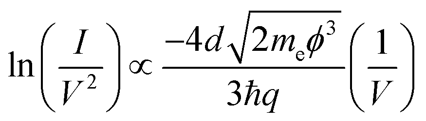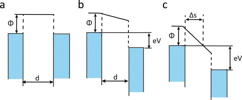 When a voltage bias is applied between two electrodes, the potential difference not only distorts the potential barrier but also provides energy for electrons to tunnel through the insulator.11 Thus, the tunnelling effect can be classified into three regimes based on the shape of the energy barrier, as shown in Fig. 2: (a) Zero bias. When no potential difference exists between the electrodes, the energy barrier is rectangular. (b) Low bias. A small voltage transforms the barrier into a trapezoidal shape. In this regime, the tunnelling current (I) under an applied voltage V can be approximated by: