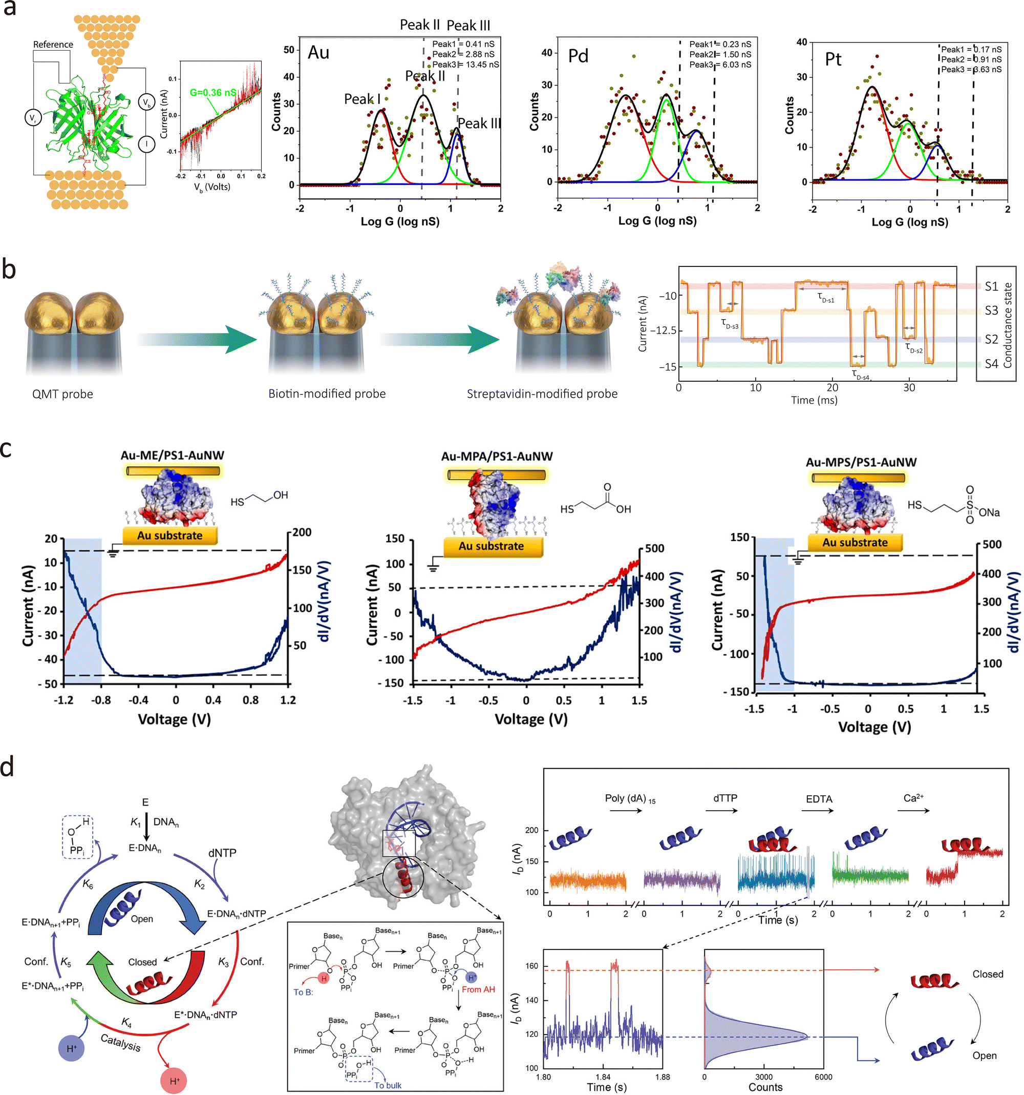 | Fig. 30 (a) Schematic illustration of streptavidin molecular junction and corresponding conductance distribution through Ag, Pd and Pt probe. Three conductance distributions can be observed on the conductance count diagram. (b) Construction of a single streptavidin molecule junction through the biotin-modified tunnelling probe. The corresponding current–time trace under – 300 mV demonstrates that there are four conductance states in streptavidin, indicating four possible electron transport pathways. (c) Schematic illustration of Anchoring PS1 in different orientations between gold electrodes through different linkers leads to different conductance properties. (d) Schematic illustration of nucleotide addition catalytic cycle of human Pol β (hPol β) through monitoring the conductance changes in the hPol β catalytic process. Panel (a) is reprinted with permission from ref. 283, Copyright (2020), American Chemical Society. Panel (b) is reprinted with permission from ref. 85, Copyright by Longhua Tang (2022), under CC BY 4.0 license. Panel (c) is reprinted with permission from ref. 284, Copyright (2023), American Chemical Society. Panel (d) is reprinted with permission from ref. 285, Copyright (2024), Advanced Science published by Wiley-VCH GmbH. | ||