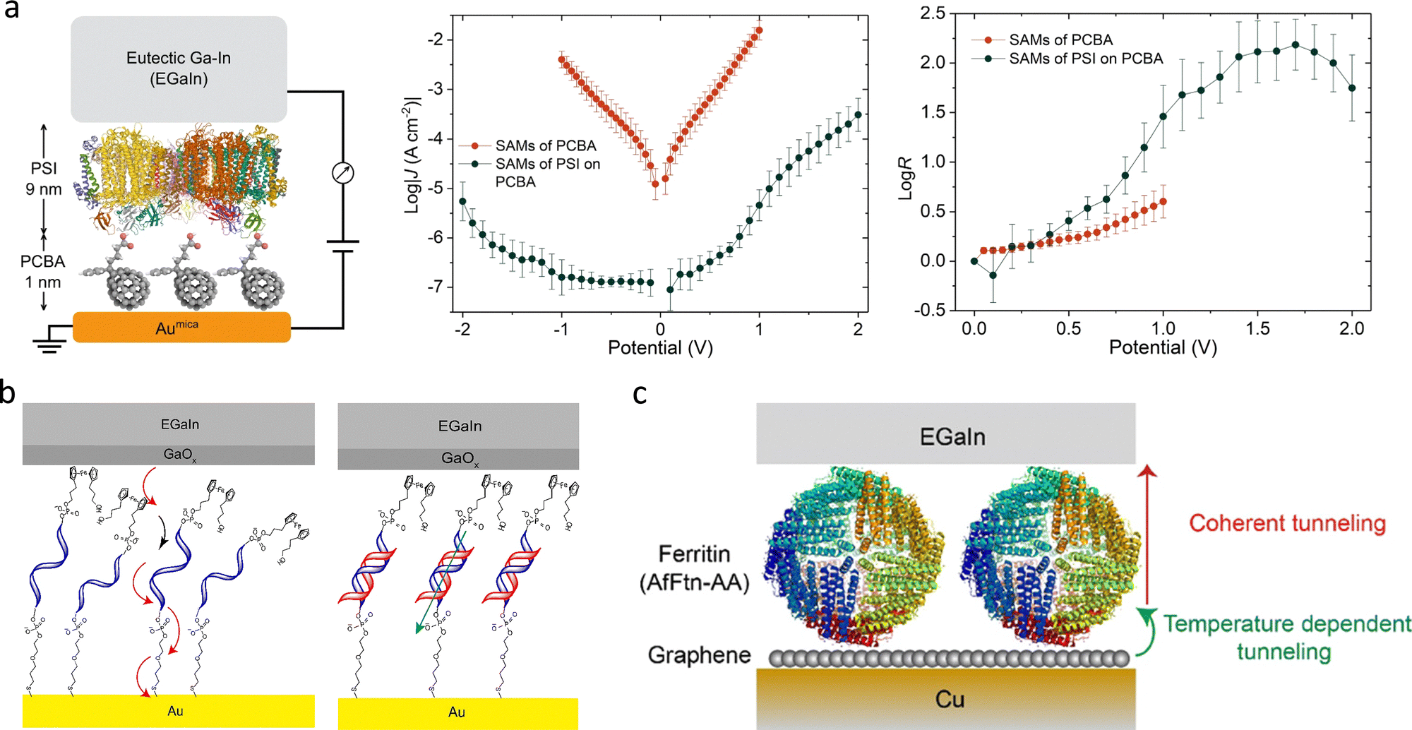 Beyond monomeric proteins, quantum tunnelling platforms can also reveal the structural properties of complex biological systems. For instance, Photosystem 1 complex (PS1) is one of the most efficient natural systems for light harvesting and conversion. Through constructing an Au-linker/PS1/Au NanoWire (AuNW) configuration, Fereiro et al. discovered a directional rectification phenomenon in PS1. By applying different linkers, namely mercaptopropanoic acid (MPA), 2-mercaptoethanol (ME), and 3-mercapto-1-propanesulfonate (MPS), PS1 was anchored on the substrate in different orientations between the Au substrate and AuNW. The current–voltage characteristics of PS1 revealed a tenfold difference in absolute conductivity value at a voltage bias of −1.5 V in the Au-ME/PS1 Au and Au-MPS/PS1 Au systems.284 (Fig. 30(c)) Further ultraviolet photoelectron spectroscopy (UPS) revealed that through altering the overall orientation of PS1, the intrinsic dipole direction of PS1 can be modulated, thereby changing the rectification direction. These findings provide important insights into electron transport in photosynthetic proteins and demonstrate how tunnelling junctions can probe orientation-dependent charge transport.