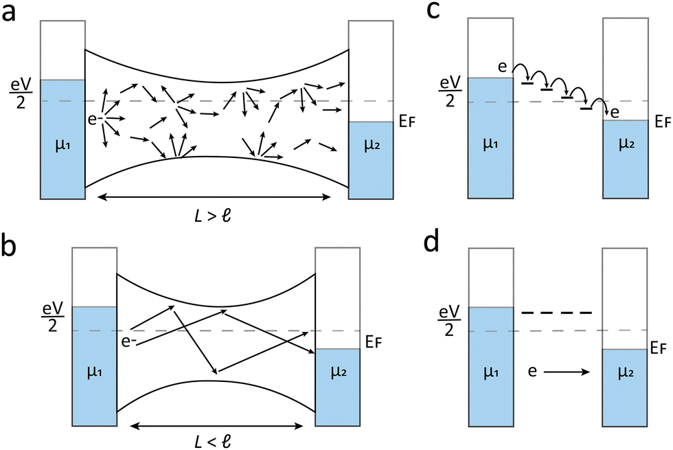 | Fig. 3 Schematic diagram of (a) diffusion transport, (b) ballistic transport, (c) hopping tunnelling and (d) coherent tunnelling. | ||