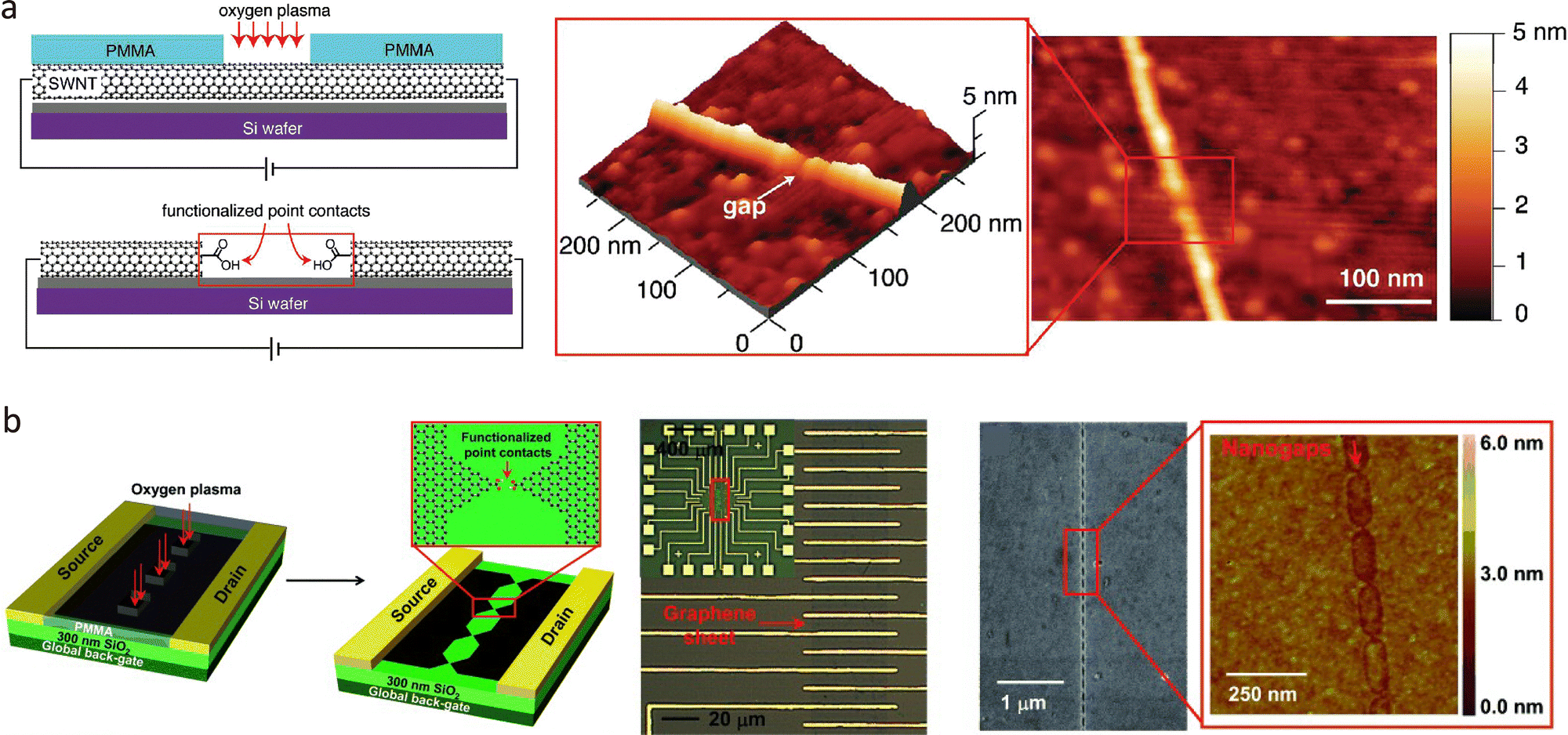 In addition to metallic electrodes, carbon-based materials such as single-walled carbon nanotubes (SWNTs) and graphene are highly suitable for quantum tunnelling sensors due to their excellent electrical conductivity, mechanical robustness, and thermal stability. Compared to metals, carbon materials offer superior chemical compatibility with organic molecules, facilitating coupling via π–π interactions and covalent bonding.72 In 2004, Qi et al. reported the application of electrical breakdown to SWNTs and the fabrication of nanogap electrodes with a 6 nm width.73 Later, in 2006, Guo et al. applied local oxygen plasma etching through a photolithographically defined PMMA window to create nanogaps in SWNTs, as shown in Fig. 5(a).31 Moreover, this process not only forms the nanogap but also oxidises the surface to carbonyl groups, further reducing the gap distance and enabling molecular capture to form a CNT–single-molecule–CNT junction. These methods enable sub-10 nm electrode separations with controlled geometries. Furthermore, functionalising CNTs with various anchoring groups enables the detection of a wide range of single molecules, including targets such as enzymes and proteins.74 FIB techniques have also been applied to break CNTs with nanometre precision, offering another route to fabricate single-molecule junctions.75,76