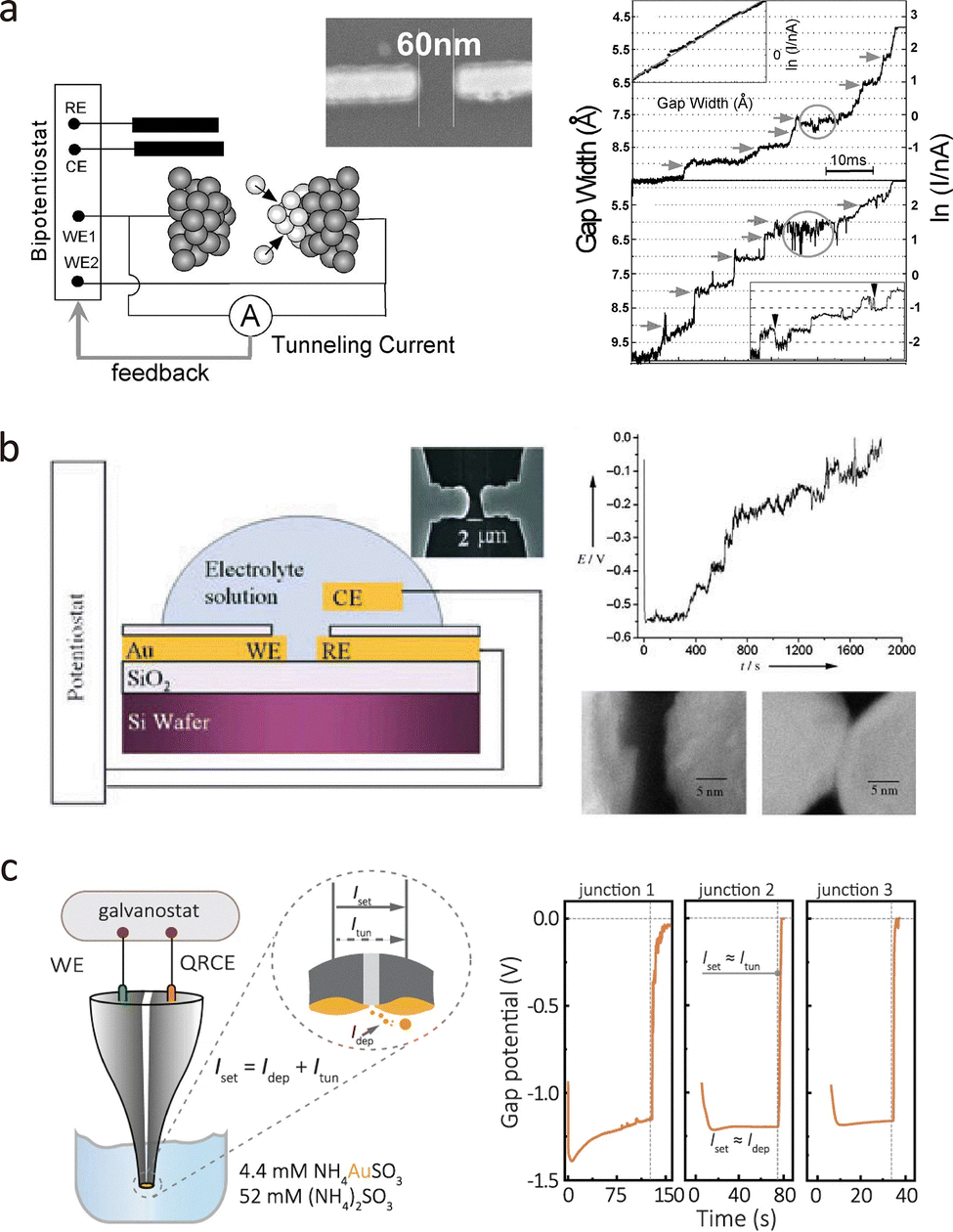 | Fig. 6 Nanogap fabrication via electrochemical methods. (a) Schematic illustration (left) of the experimental setup. The right panel shows typical gap distance-time and current–time responses. (b) Galvanostatic feedback control deposition of nanogap electrodes. The right panel displays a typical voltage-time response and an SEM image of the nanogap. (c) Galvanostatic feedback control deposition of Au on the dual-barrel carbon nanoelectrodes. The right panel illustrates the typical voltage-time feedback control configuration. Panel (a) is reprinted with permission from ref. 33, Copyright (2000), AIP Publishing. Panel (b) is reprinted with permission from ref. 81, Copyright (2005), Wiley-VCH Verlag GmbH & Co. KGaA, Weinheim. Panel (c) is reprinted with permission from ref. 34, Copyright (2021), Springer Nature. | ||