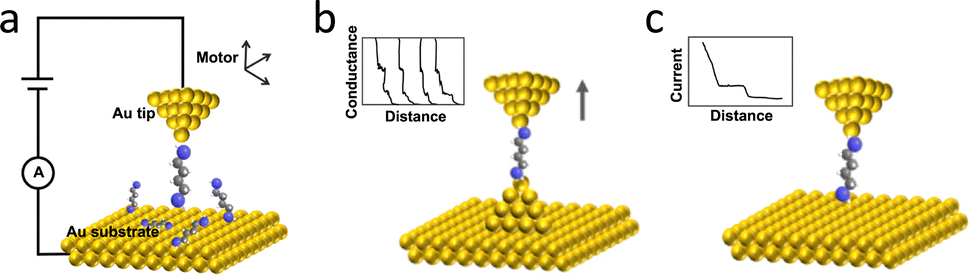 Since then, STM-BJ techniques have been widely applied to the study of single-molecule properties by monitoring changes in conductance. Fig. 7(a) illustrates the configuration and main experimental setup of the STM-BJ. Depending on whether the tip interacts with the substrate during movement, STM-BJ experiments are generally classified into two modes: hard-contact and soft-contact modes, as shown in Fig. 7(b) and (c). In the hard-contact mode, the metallic tip (typically gold) makes direct contact with the substrate and is then retracted, leading to atomic-scale thinning and the formation of a single-atom contact prior to rupture. In the soft-contact mode, the tip is suspended close to the substrate. The molecules can diffuse into the nanogap and are transiently trapped during tip retraction. By pulling the tip to break the single-molecule contact, current–distance (I–z) responses can be recorded to provide insight into single-molecule behaviour.2