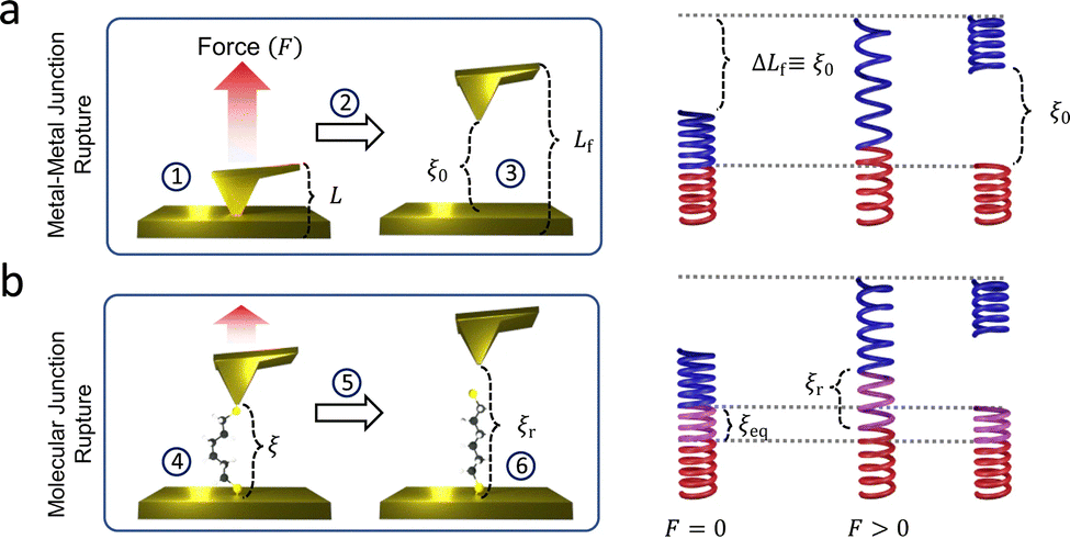 | Fig. 8 Atomic force microscopy-break junction. The schematic demonstration of the rupture of (a) a metal–metal junction and (b) a molecular junction. Panel is reprinted with the permission from ref. 109, Copyright (2023) Springer Nature. | ||