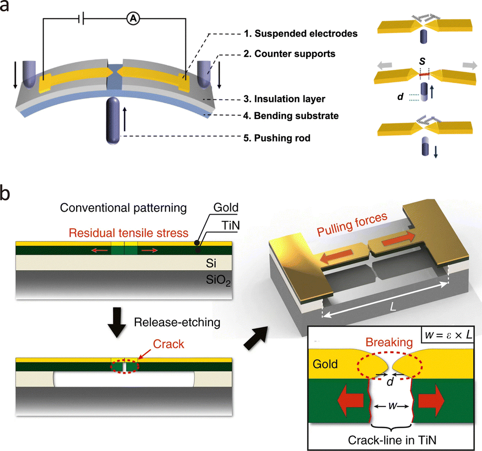 | Fig. 9 (a) Schematic illustration of MCBJ experimental setup and single molecule detection procedure. (b) Schematic demonstration of the nanogap fabrication through crack-defined break junction. Panel (a) is reprinted with permission from ref. 2, Copyright (2022) by Yi Zhao, under Creative Commons Attribution 3.0 license. Panel is reprinted with permission from ref. 122, Copyright (2018), Springer Nature. | ||