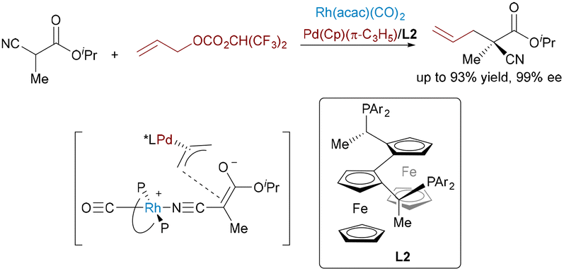 In 1996, Ito and Sawamura reported the first highly enantioselective transition-metal-catalyzed allylic alkylation to construct acyclic quaternary stereocenters using a Pd/Rh bimetallic system (Scheme 10).5 The π-allylpalladium complex activated the electrophile, while the chiral Rh(I) complex generated a chelated enolate and induced asymmetry. Mechanistic studies confirmed that rhodium was essential for enantioinduction and palladium was essential for electrophile activation, demonstrating the potential of synergistic bimetallic catalysis in asymmetric synthesis.
