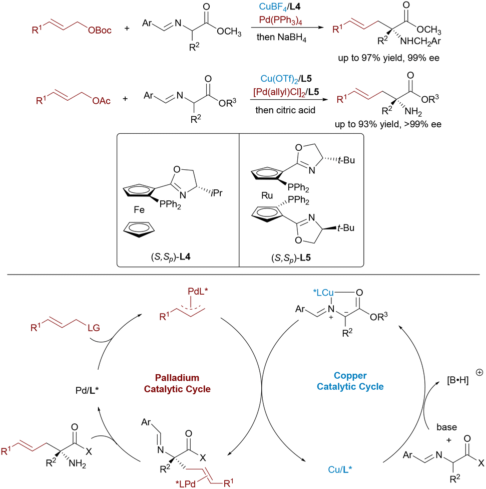 Optically active α,α-disubstituted α-amino acids (α,α-AAs) are key components of enzyme inhibitors and bioactive natural products. Nevertheless, the stereoselective synthesis of α,α-AAs remains challenging, particularly involving the construction of quaternary stereocenters. In 2017, Wang23 and Zhang24 independently reported dual catalytic systems featuring Pd and Cu complexes for the enantioselective allylic alkylation of aldimine esters (Scheme 12). In these systems, a chiral Cu(I)/Phosferrox complex facilitates the generation of nucleophilic azomethine ylides, while a Pd(0) catalyst activates allylic carbonates to form electrophilic π-allyl species. These synergistic systems afforded α-quaternary amino acids with excellent enantioselectivity and yield. Subsequently, Wang and Dang advanced a more sustainable variant by employing racemic allylic alcohols as electrophilic partners,25 using Et3B as a Lewis acid activator to promote the formation of π-allyl complexes. This strategy allowed direct access to α-AAs through regio- and stereodivergent Cu/Pd catalysis, thereby further expanding the synthetic utility of dual-metal systems in constructing densely functionalized chiral amine frameworks.