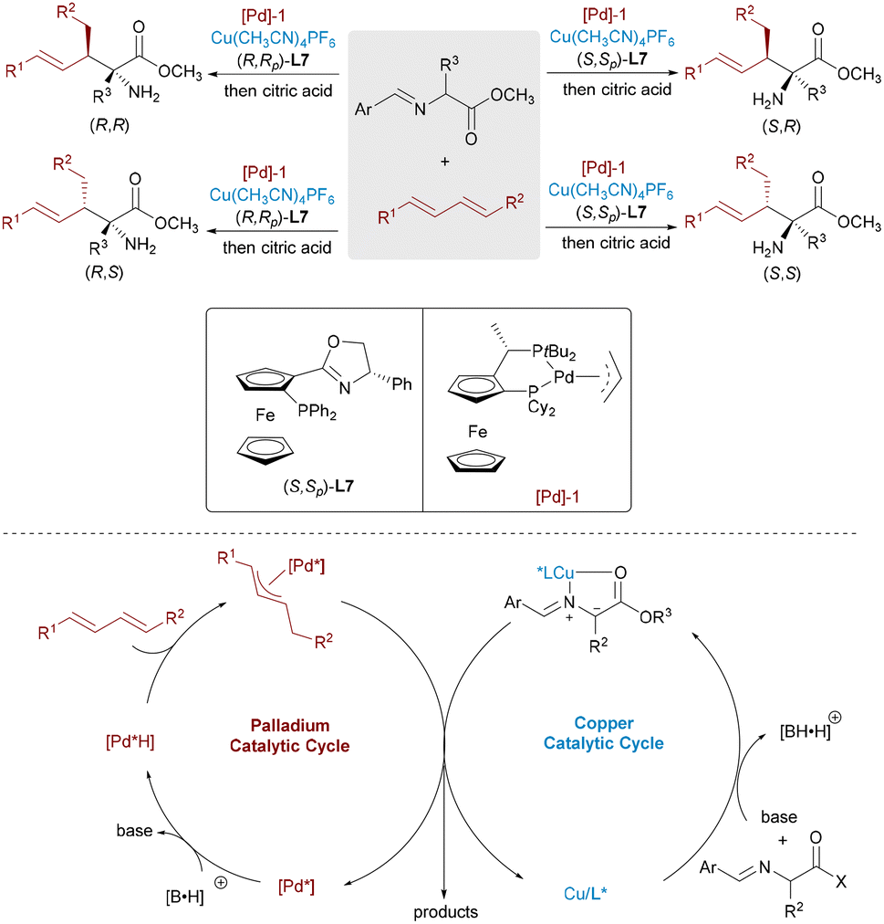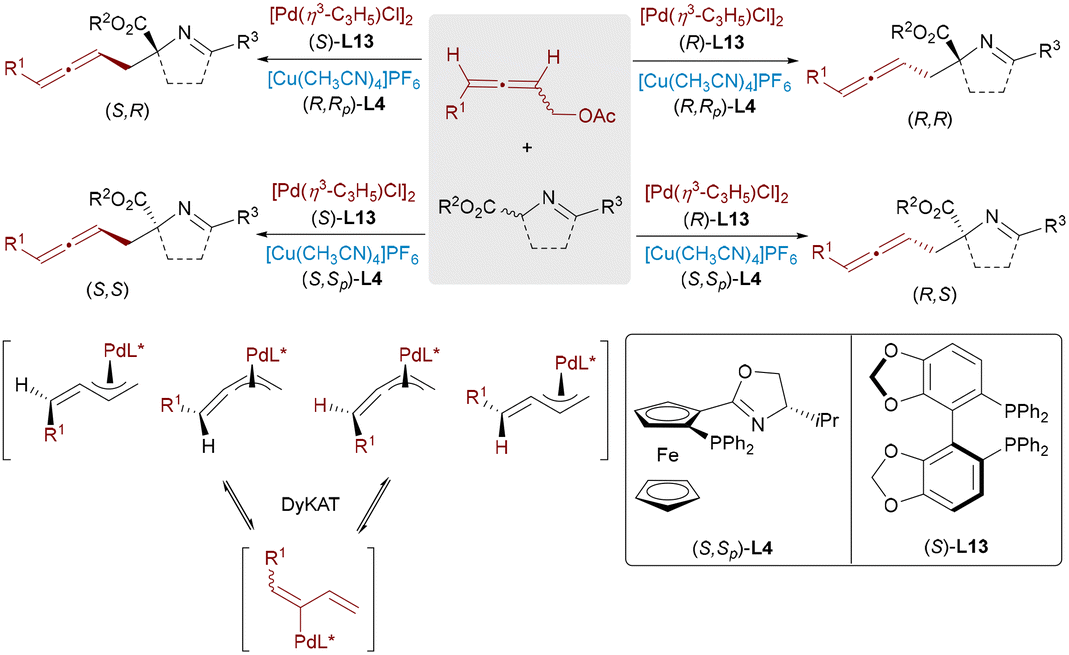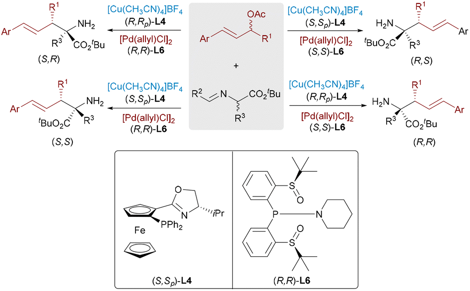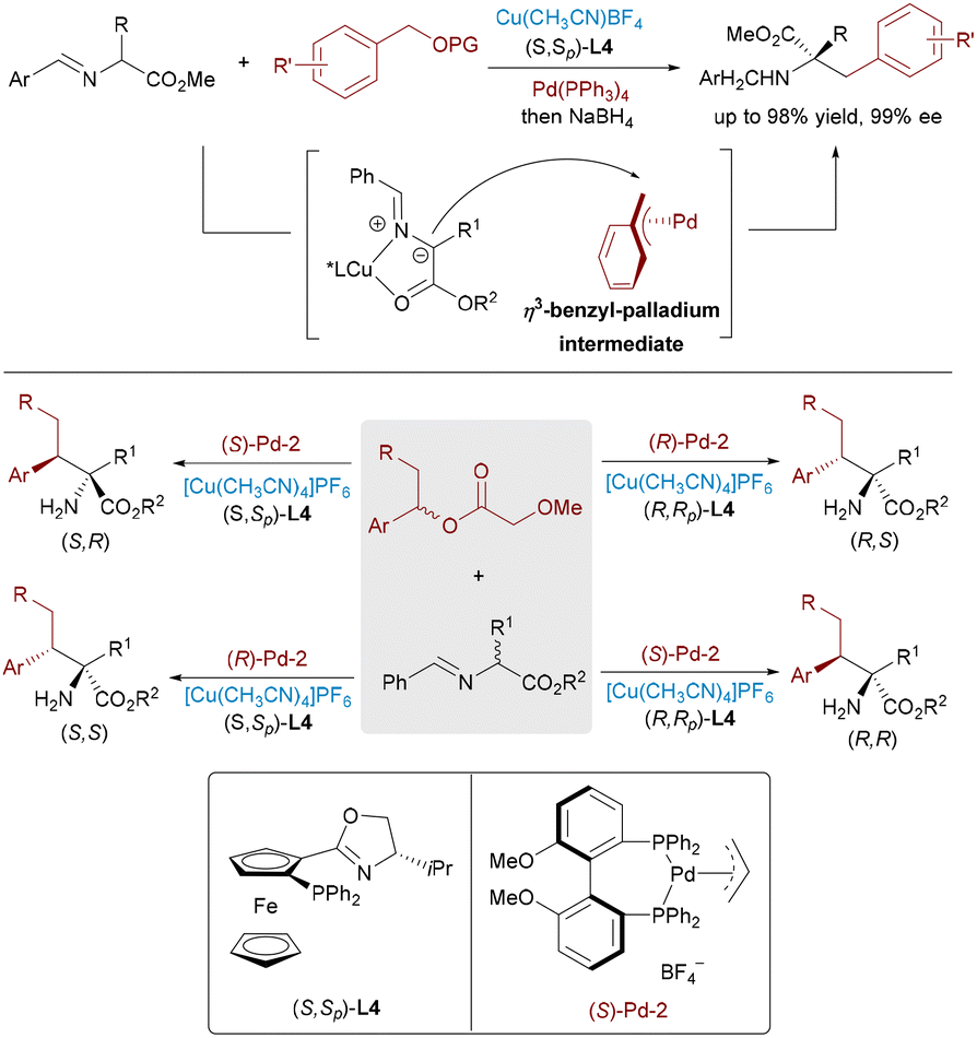 Dynamic kinetic asymmetric transformation (DyKAT)26 offers an efficient route for the conversion of racemic substrates into enantiomerically enriched products via simultaneous catalysis and racemization. In 2020, Zhang and Liao combined this strategy with Cu/Pd-catalyzed allylic alkylation of aldimine esters using racemic unsymmetrical 1,3-disubstituted allyl acetates.27 This approach delivered α,α-disubstituted α-amino acids bearing vicinal stereocenters with high enantioselectivities (up to >99% ee) and diastereoselectivities (up to >20