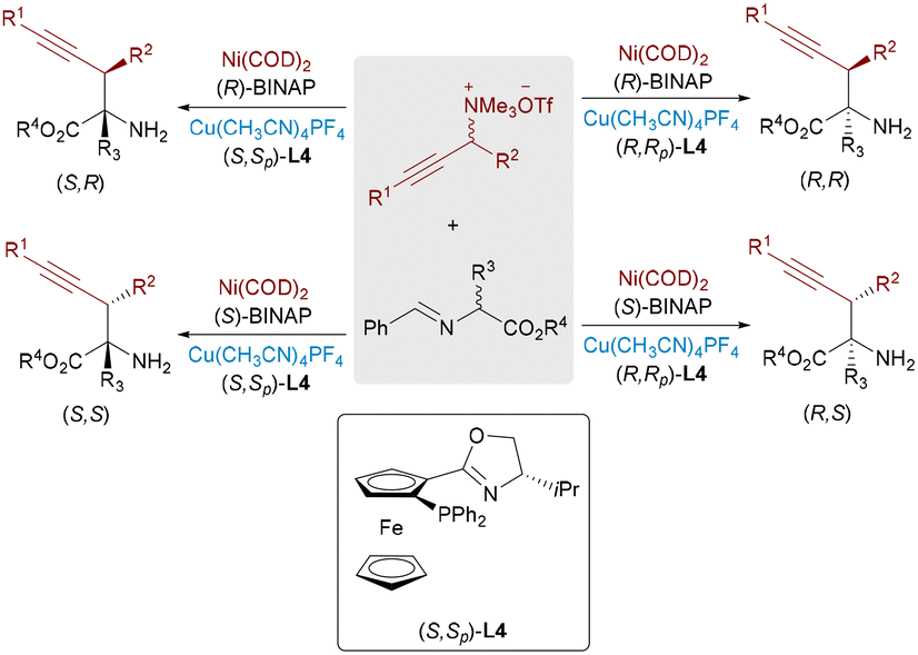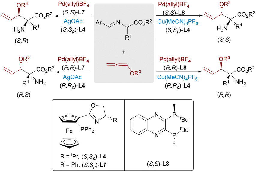 | Scheme 15 Stereodivergent coupling of alkoxyallenes and aldimine esters by Pd/Cu and Pd/Ag catalysis. | ||