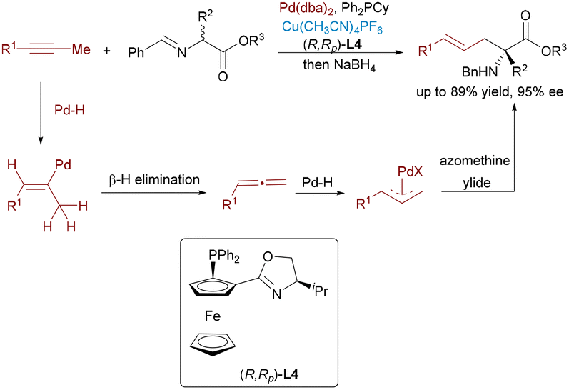 The Wang group described an innovative dual catalytic system that integrates chiral Cu(I) complexes with palladium nanoparticles to accomplish enantioselective allylic alkylation between alkynes and aldimine esters (Scheme 16).31 The Pd–H species, generated via protonation of Pd(0) followed by base-assisted deprotonation, undergoes hydropalladation of the alkyne to form a π-allyl-Pd intermediate. This species couples stereoselectively with the Cu-bound azomethine ylide, delivering the chiral product and regenerating both catalysts.
