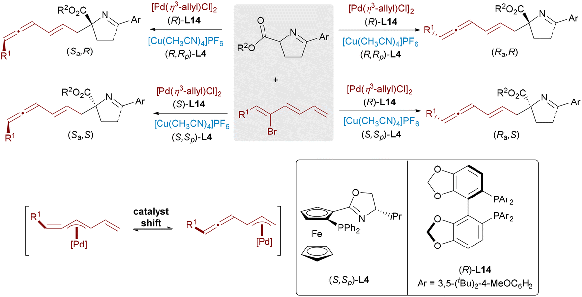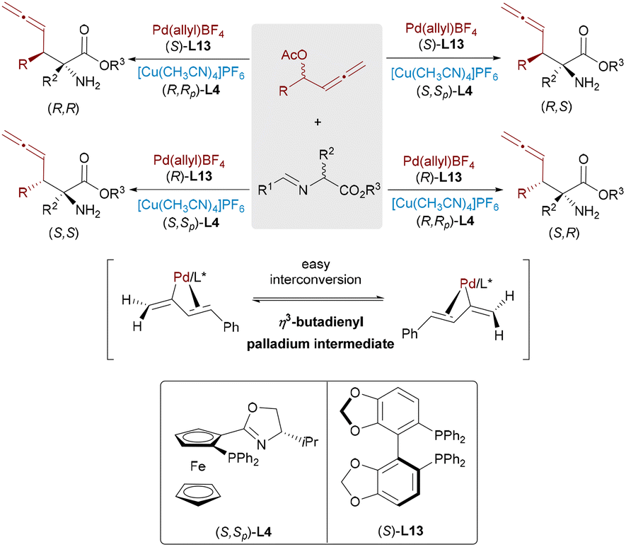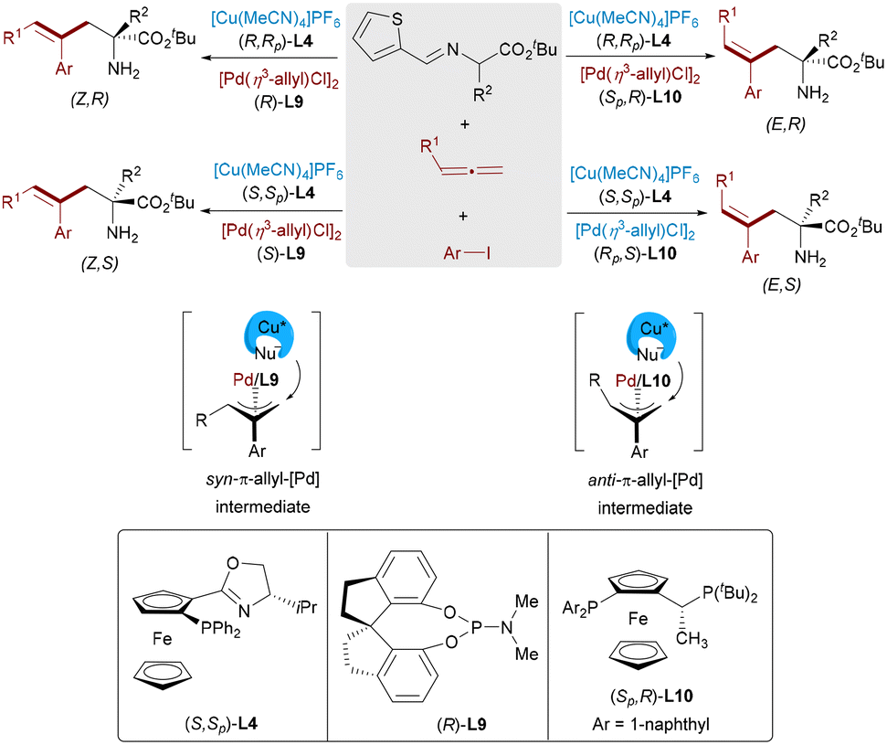 C bond, Zhang and Ma designed a Pd/Cu bimetallic catalytic system for three-component coupling of aryl iodides, allenes, and aldimine esters (Scheme 17).32 By rational pairing of chiral ligands of two metal catalysts, all four stereoisomeric α-amino acids [(Z,R), (Z,S), (E,R), and (E,S)] showed outstanding selectivity. Mechanistic studies revealed that the Pd catalyst determines the E/Z configuration through selective formation of syn- or anti-π-allyl intermediates, whereas the Cu catalyst primarily governs the enantioselectivity. DFT calculations and experimental studies demonstrated that the E-selectivity arises from the thermodynamically favored anti-intermediate, whereas Z-isomers result from nucleophilic attack on the syn form.