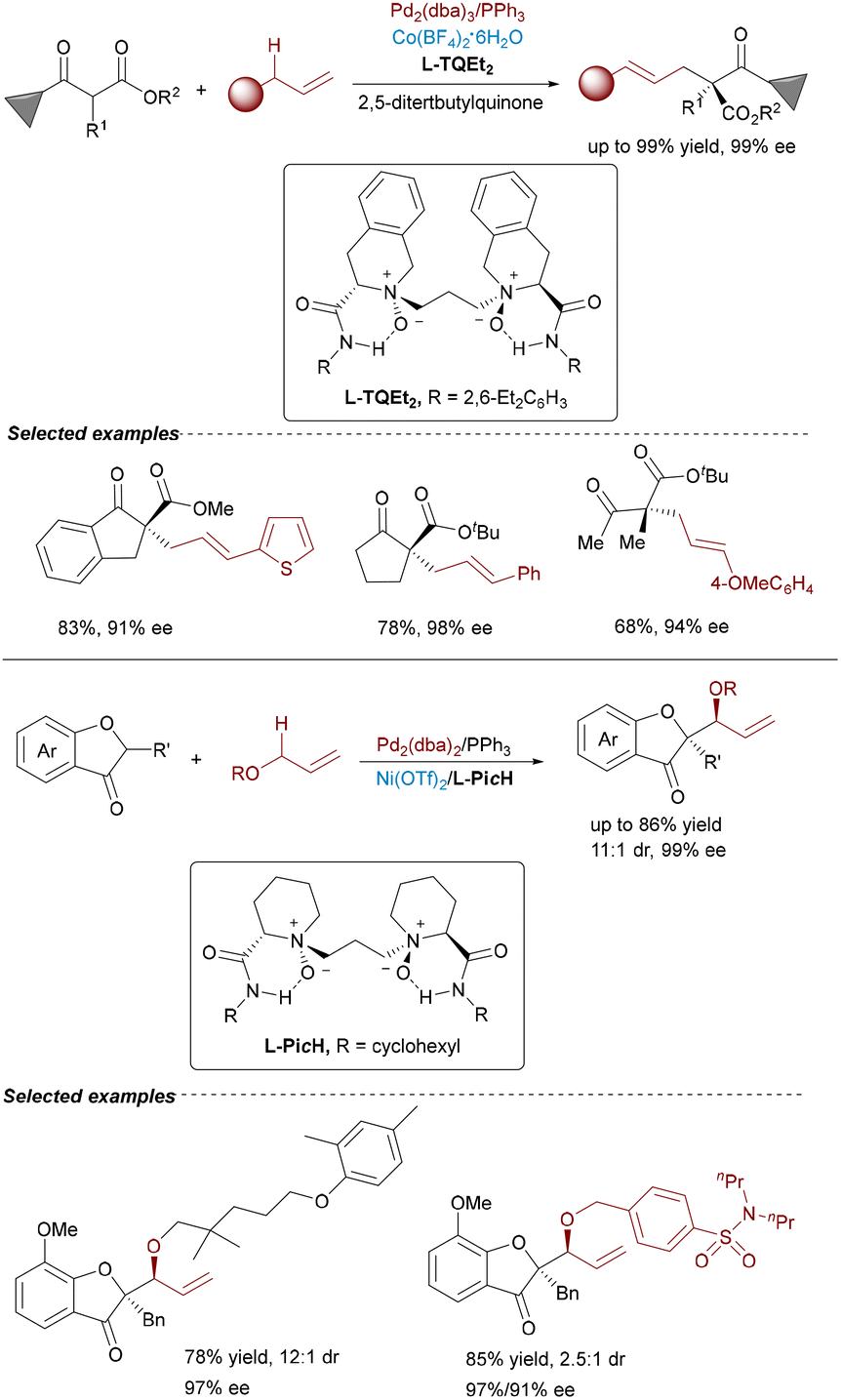 Conventional enantioselective allylic substitution reactions often rely on pre-activated electrophiles, necessitating additional synthetic manipulations. Feng and Liu overcame this limitation by developing a Pd/Co dual catalytic system for direct asymmetric allylic C–H alkylation of allylbenzenes and aliphatic olefins with β-ketoesters and oxindoles (Scheme 18, top).33 This approach combines achiral Pd(0) catalysis for C–H activation with a chiral N,N′-dioxide–Co(II) complex to achieve asymmetric induction. Notably, this design addresses the persistent challenges of limited chiral ligand availability and insufficient stereocontrol encountered in traditional Pd-catalyzed C–H alkylation. Under the optimized conditions, the protocol delivered a wide range of products in high yields (up to 99%) and excellent enantioselectivities (up to 99% ee), including biologically relevant compounds. Very recently, Feng, Wu and Liu developed a regiodivergent allylic C–H alkylation of allyl ethers with carbonyl nucleophiles, benzofuran-3(2H)-one, affording branched products with excellent regio- and stereoselectivity (Scheme 18, bottom).4b Feng and Liu also developed a solvent-controlled, enantioselective allylic C–H alkylation of 2,5-dihydrofuran via Pd(0)/Ni(II) synergistic catalysis. By tuning the reaction solvent, the authors could effectively modulate the regioselectivity and enantioinduction of the alkylation process.3p