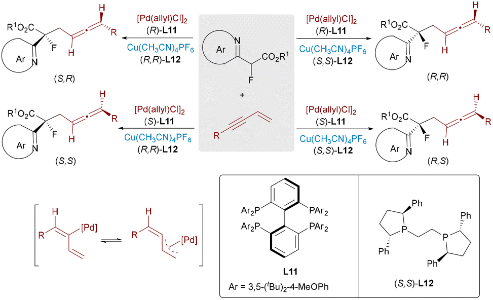 The incorporation of fluorinated stereocenters plays a crucial role in pharmaceutical and materials chemistry, as fluorine substitution is known to improve metabolic stability, bioavailability, and binding selectivity. In 2021, He and co-workers disclosed a Pd/Cu dual-catalytic system for the stereodivergent coupling of enynes and α-fluoroesters to access tertiary fluoride-tethered allenes bearing both central and axial chirality (Scheme 19).34 The protocol accommodates diverse substrates, including drug-derived enynes, and further allows for axial-to-central chirality transfer, leading to the formation of fluorinated hydrofuran scaffolds. Kinetic studies reveal time-dependent epimerization of the allene axis, while ligand permutations allow access to all four stereoisomers. This work significantly expands the realm of stereodivergent catalysis to include systems bearing both central and axial elements of chirality.