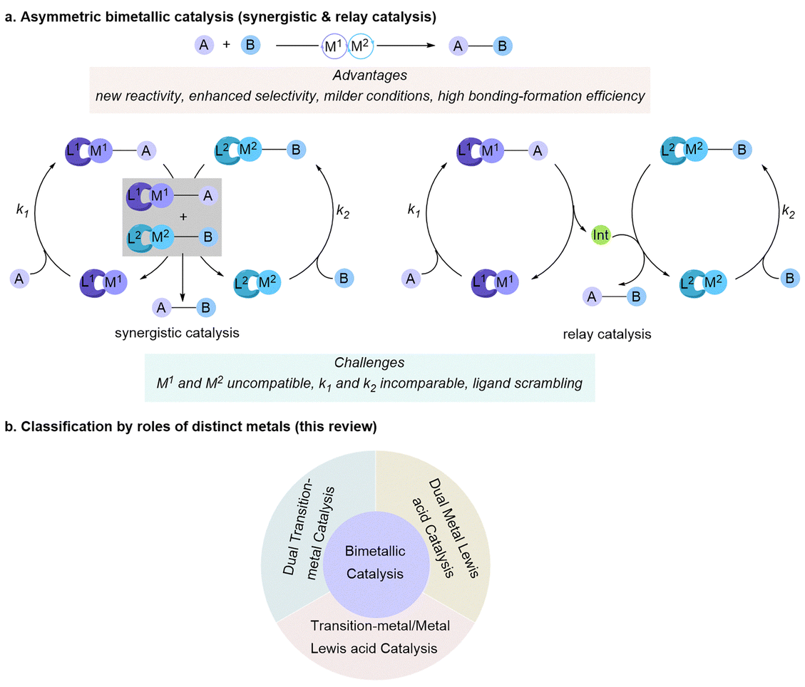 In this review, we present up-to-date promising examples which feature asymmetric bimetallic catalysis to enable access to enantioenriched molecules. Transition-metal photocatalysis8 and binuclear transition-metal catalysis,2a,9 which have been well overviewed by other reviews and accounts, will not be covered in this review. We will discuss the development of asymmetric bimetallic catalysis and the distinct roles played by different metals, including dual metal Lewis acid catalysts, transition-metal/metal Lewis acid catalysts, and dual transition-metal catalysts (Scheme 1b). Metal Lewis acids typically activate substrates through coordination, while the chemical valence generally remains constant throughout the reaction process. Transition metal catalysts typically undergo a cascade of oxidative addition and reductive elimination, during which the oxidation state may change throughout the catalytic cycle. In this review, a metal center that forms a metal–carbon bond with a reactant during the reaction process is referred to as a transition-metal catalyst. Otherwise, it is classified as a Lewis acid catalyst. Notably, we will emphasize catalyst pairings, the scope of the substrates, and the typical proposed catalytic mechanism, which plays a crucial role in facilitating the reactivity of both known and novel transformations.