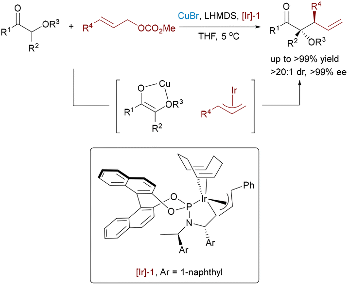 | Scheme 64 Rh/Pd/CPA-catalyzed asymmetric three-component allylic alkylation of α-diazo carbonyls, alcohols, and allyl carbonates. | ||
