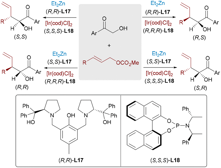 Extending synergistic bimetallic catalysis to non-adjacent stereocenters, You reported a Cu/Ir relay catalytic system for stereodivergent tandem asymmetric conjugate addition/allylic alkylation (Scheme 63).91 Copper catalysis (with chiral phosphoramidite ligand L18) generates enolates from cyclic enones and dialkylzinc, while iridium catalysis (using phosphoramidite) directs allylic substitution with cinnamyl acetates. This sequential nucleophile-electrophile pairing constructs 1,3-chiral centers in cyclohexanones with high stereoselectivity.