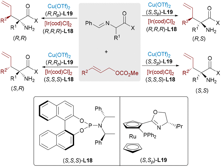 In 2018, the Zhang and Wang group independently reported significant advances in Ir/Cu bimetallic-catalyzed allylation reactions with aldimine esters (Scheme 28).48 By employing specific combinations of two chiral catalysts, all stereoisomers can be systematically obtained from the same starting materials while maintaining consistent reaction conditions. While mechanistically analogous to the established Pd/Cu-catalyzed allylic alkylation of aldimine esters, the present catalytic system demonstrates a distinct product profile by selectively generating branched-chain α,α-disubstituted α-amino acids.