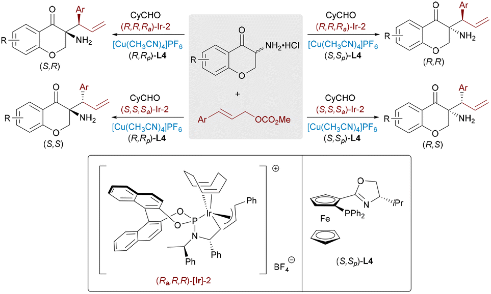 Due to the high nucleophilicity and basicity of free amines, protective group strategies are commonly employed in synthetic transformations to prevent catalyst deactivation or undesired side reactions. Challenging this convention, Zhang, Sun and Huo recently achieved the stereodivergent α-allylation reaction of unprotected primary amines using a ternary catalytic system involving aldehyde, copper, and iridium catalysts (Scheme 29).49 A catalytic amount of aldehyde was used to reversibly form an imine intermediate with the α-amino chromanone substrate, which was then activated by a chiral Cu complex to generate a nucleophilic azomethine ylide. This transient species underwent regio- and stereoselective addition to an Ir–π-allyl intermediate, affording α-allylated products bearing two adjacent stereocenters. The process efficiently furnished all four possible stereoisomers from the same starting material through ligand-controlled stereodivergence, without requiring amine protection.