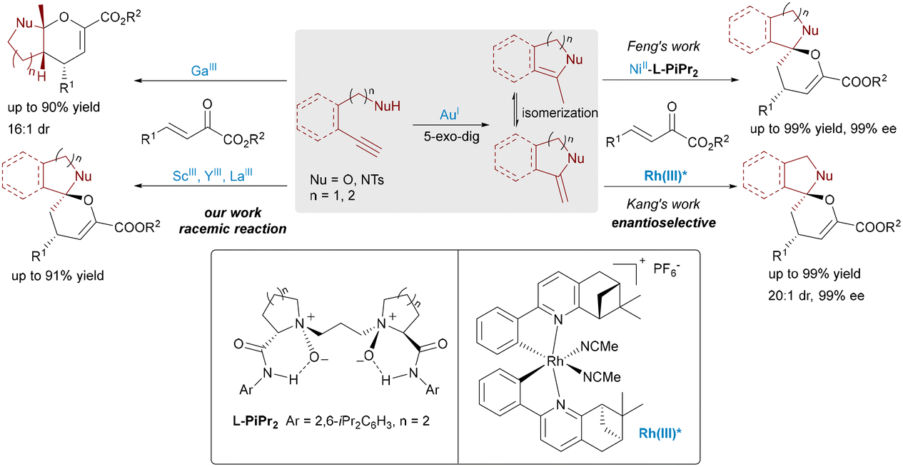 Building on this foundation, Feng et al. reported a significant advancement in enantioselective synthesis through the development of an asymmetric dual Lewis acid catalytic system (Scheme 2, right).11 They achieved highly stereocontrolled IED-HDA reactions by combining Au(I) with a Ni(II) complex coordinated by a chiral N,N′-dioxide ligand (Feng ligand),12 which represents a privileged class of modular and tunable organic ligands capable of coordinating with a wide range of metal centers to form highly efficient Lewis acid catalysts. Notably, this dual catalytic system effectively suppressed isomerization of the reactive enamide intermediate, selectively favoring spiro over fused products. In 2018, Kang's group demonstrated a dual Lewis acid catalytic system featuring achiral Au(I) and chiral Rh(III) in relay mode, enabling efficient asymmetric synthesis of spiroketals and spiroaminals.13