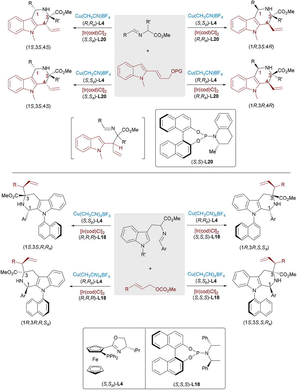 Tetrahydro-γ-carboline frameworks constitute a privileged class of indole alkaloids, extensively recognized for their prevalence as key structural elements in biologically active compounds and therapeutic agents. The Wang group developed a synergistic Ir/Cu-catalyzed asymmetric cascade reaction that combines allylic substitution with iso-Pictet–Spengler cyclization to construct tetrahydro-γ-carbolines bearing multiple stereocenters in a single catalytic process (Scheme 31, top).53 The Ir catalyst forms electrophilic π-allyl intermediates from indole-allyl carbonates, which couple with Cu-activated azomethine ylides, followed by stereospecific intramolecular cyclization. Similarly, tetrahydro-β-carbolines with up to four stereocenters, including a C–N axial unit, were accessed via Ir/Cu-catalyzed allylation and Brønsted acid-mediated Pictet–Spengler cyclization under mild conditions (Scheme 31, bottom).54