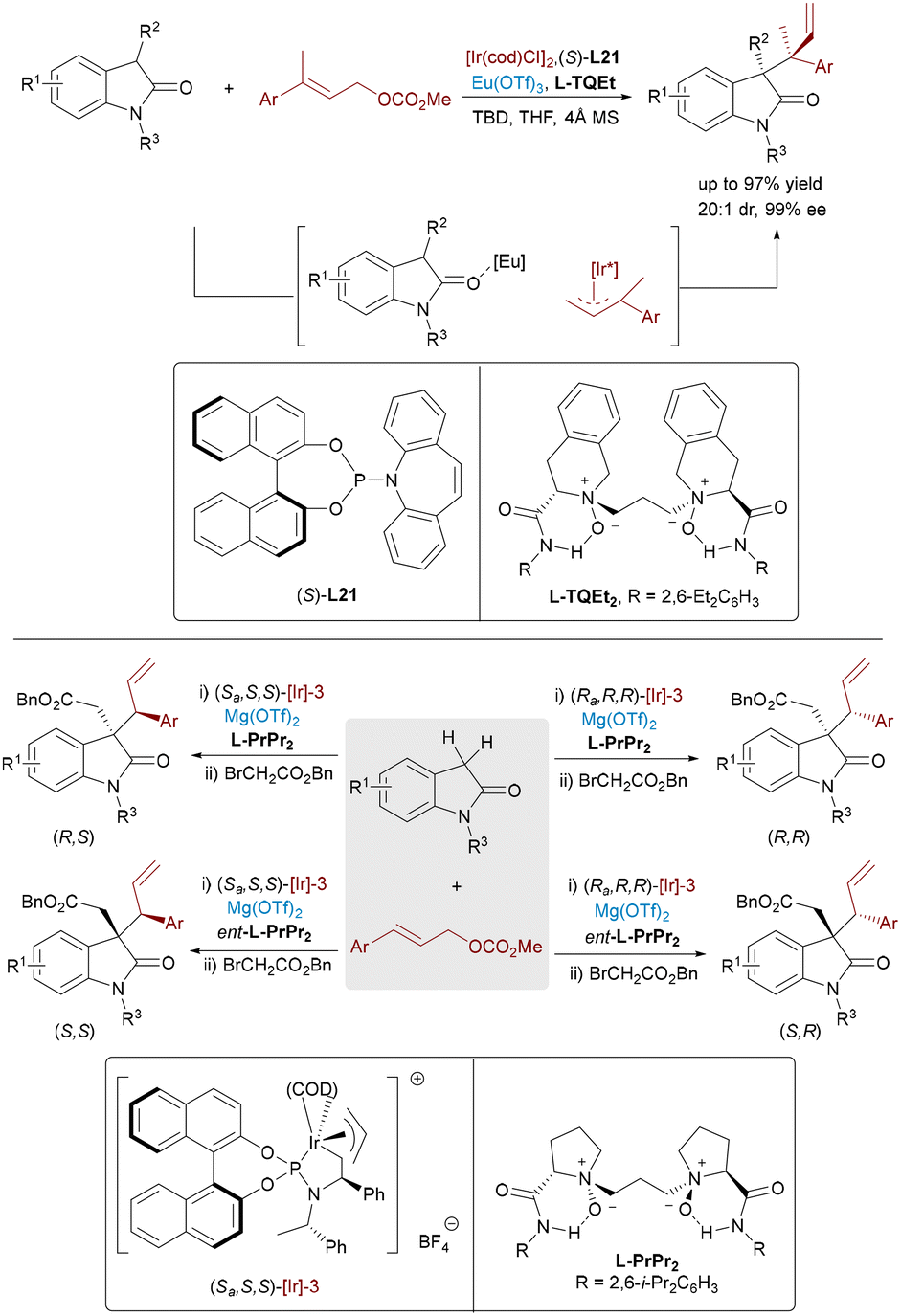1 dr even with sterically demanding substrates.56 Notably, the chiral Eu complex enhances reactivity and stereocontrol, though diastereodivergence via ligand modulation remains elusive. To access all four stereoisomers of 3,3′-disubstituted oxindoles bearing contiguous stereocenters, Feng and co-workers devised a sequential Ir/Mg-catalyzed three-component cascade involving allylic alkylation followed by diastereoconvergent nucleophilic alkylation (Scheme 32, bottom).57 The chiral iridium complex generated an Ir–π-allyl intermediate from the allyl carbonate, which undergoes enantioselective allylation at the oxindole's C3 position. The resulting product then tautomerizes rapidly, allowing the chiral magnesium catalyst to coordinate the enolate and mediate diastereoconvergent C3′-alkylation with the electrophile.