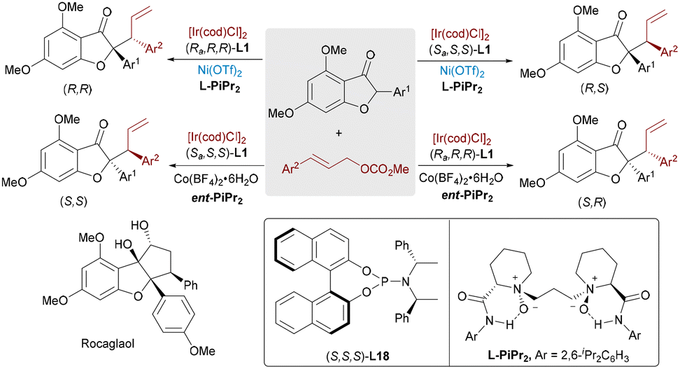 Flavaglines, a class of natural products bearing a densely functionalized cyclopenta[b]benzofuran core, display broad pharmacological activities, including anticancer, anti-inflammatory, and antiviral effects. In 2022, Feng and Liu demonstrated a synergistic dual-metal-catalyzed asymmetric allylic alkylation of benzofuran-3(2H)-one as a key step for the stereodivergent total synthesis of rocaglaol (Scheme 33).4a By combining a chiral N,N′-dioxide-Co or Ni Lewis acid with a chiral phosphoramidite/Ir(I) complex, all four stereoisomers of the α-allylated products were accessed with high diastereoselectivity and excellent enantiocontrol (up to >19