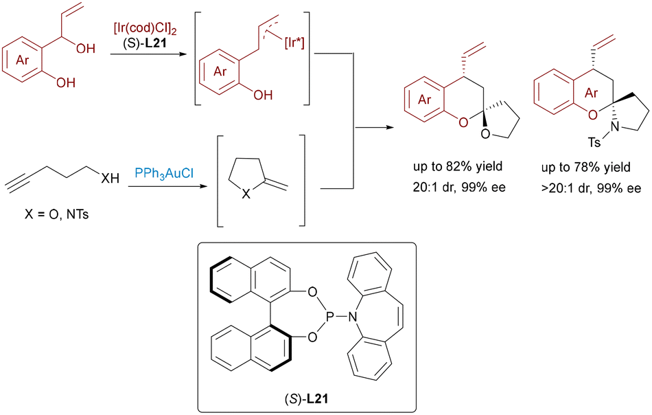 Spiroketals are essential frameworks in numerous bioactive natural products and medicinal compounds, prompting continued interest in enantioselective strategies for their synthesis. In 2022, Deng and Yang depicted a novel Ir/Au dual-catalytic system for the enantioselective synthesis of spiroketals and spiroaminals through a cascade reaction between racemic 2-(1-hydroxyallyl)phenols and alkynols/alkynamides (Scheme 35).59 Au-catalyzed cycloisomerization forms reactive vinyl ether or enamide intermediates, which undergo enantioselective coupling with Ir–π-allyl species, followed by intramolecular spirocyclization via a hydrogen-bond-stabilized Zimmerman–Traxler transition state, furnishing spirocyclic products with excellent stereocontrol.