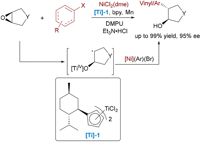 While epoxide ring-opening reactions have been well-established in organic synthesis, previous approaches struggled with enantioselective C–C bond formation using aryl nucleophiles, typically requiring harsh conditions or showing limited functional group tolerance. Weix and co-workers developed a Ni/Ti dual-catalytic system for enantioselective cross-coupling between aryl halides and epoxides, achieving trans-β-arylcycloalkanols in 57–99% yields and 78–95% ee under mild reductive conditions (Scheme 38).64 The chiral titanocene catalyst mediates the reductive ring-opening of the epoxide substrate, generating a β-titanoxy alkyl radical intermediate which subsequently couples with the aryl-nickel(II) species. Reductive elimination then delivers the enantioenriched product.