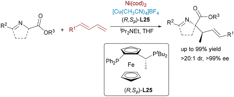 Asymmetric hydrofunctionalization of 1,3-dienes has been extensively studied with palladium and rhodium catalysts, while nickel-based systems remain less explored despite their promise in constructing chiral allylic products with vicinal stereocenters. A notable advance was achieved through a Ni/Cu dual catalytic system that enables the enantioselective coupling of 1,3-dienes with aldimine esters,65 furnishing a wide array of amino acid derivatives with high diastereo- and enantioselectivity (Scheme 39). The methodology demonstrated broad applicability across both cyclic and acyclic nucleophiles as well as structurally diverse diene substrates.