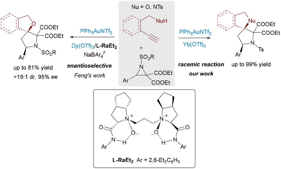 The progression from Au/σ-Lewis acid-catalyzed [4+2] cycloadditions yielding 5,6-spirocycles to [3+2] cycloadditions with aziridines, delivering versatile 5,5-spiro-N,O/N,N-heterocycles, underscores the remarkable versatility (Scheme 3).14 The strategic use of aziridines as masked 1,3-dipoles, activated by σ-Lewis acids via selective C–C bond cleavage, opens a distinct pathway previously inaccessible to other dipolarophiles. Furthermore, the integration of chiral N,N′-dioxide-lanthanide(III) complexes (e.g., Dy(III)) with achiral Au(I) catalysts successfully addresses the challenges in enantioselective control in this powerful cascade, enabling the asymmetric synthesis of complex spiroarchitectures prevalent in bioactive molecules. These developments highlight the potential of combining π-acidic gold with chiral σ-Lewis acids to unlock novel reaction manifolds and achieve precise stereochemical outcomes in the synthesis of intricate spirocyclic scaffolds.