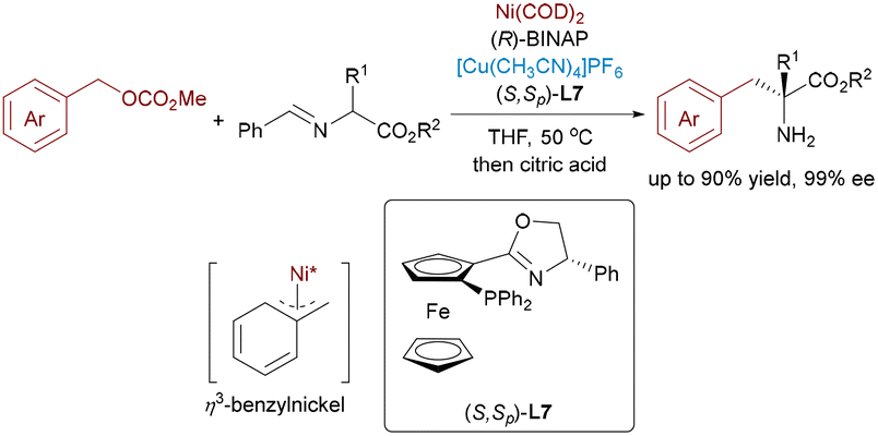 Despite the widespread application of η3-allylpalladium complexes in asymmetric transformations, their isoelectronic η3-benzylnickel counterparts remain significantly underdeveloped, primarily limited by the higher energy barrier associated with oxidative addition and dearomatization processes. In 2022, Zhang and coworkers achieved a breakthrough in asymmetric catalysis by developing a Ni/Cu bimetallic system for the benzylation of aldimine esters,66 constructing challenging α-quaternary amino acid derivatives with excellent enantioselectivity (Scheme 40). The transformation relies on a highly electrophilic η3-benzylnickel intermediate, which promotes efficient coupling under base-free conditions.