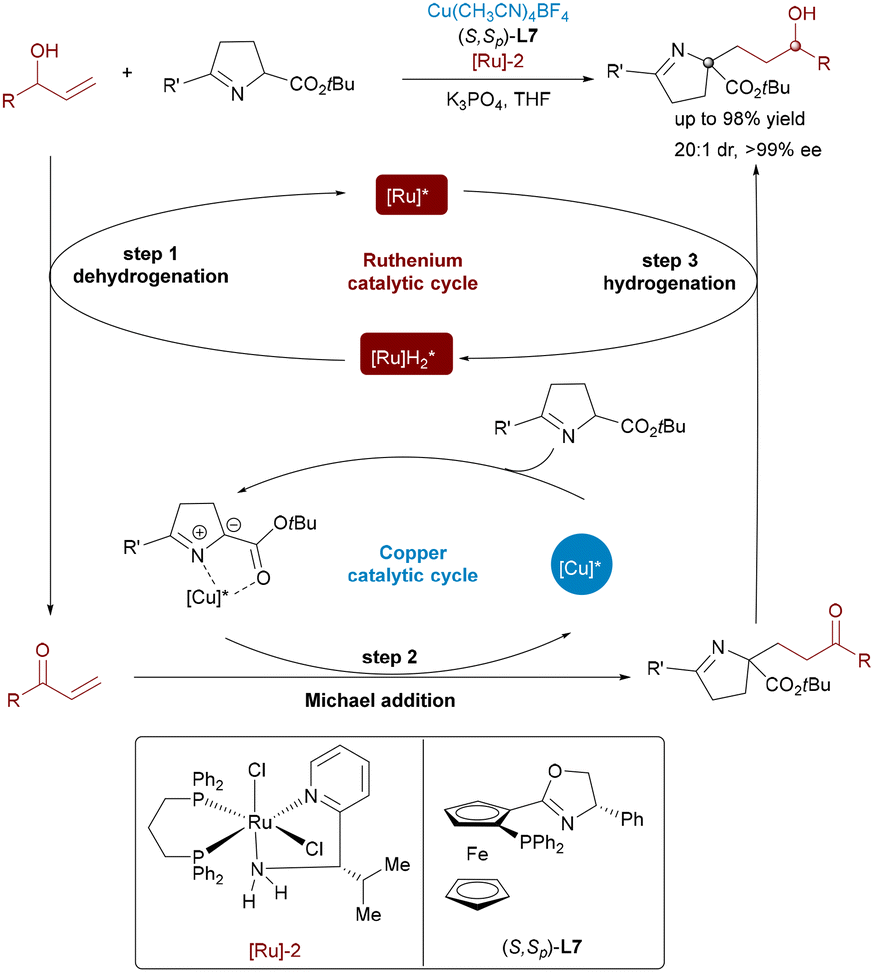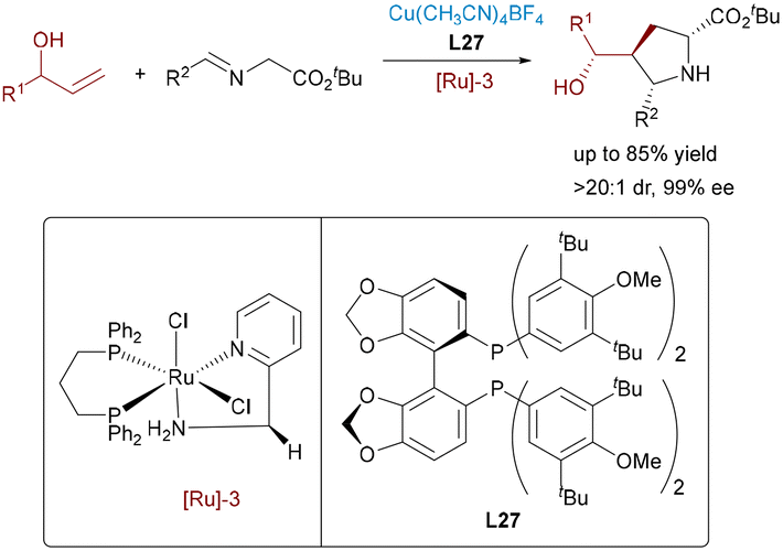 The asymmetric 1,3-dipolar cycloaddition of inert allylic alcohols presents significant challenges, primarily due to their inherently low reactivity and the necessity for pre-activation. The Wang group addressed this challenge with a Ru/Cu relay-catalyzed 1,3-dipolar cycloaddition of inert allylic alcohols with aldimine esters (Scheme 43).70 The Ru catalyst oxidizes the alcohol to a transient α,β-unsaturated carbonyl intermediate, suppressing side reactions, while the Cu catalyst promotes asymmetric 1,3-dipolar cycloaddition with azomethine ylides, forming a chiral pyrrolidine framework with excellent diastereo- and enantioselectivity.