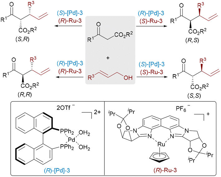 A key limitation of the asymmetric alkylation of β-keto esters is the difficulty in achieving high enantiopurity for mono-alkylated products, as the products readily racemize via keto–enol tautomerization under basic or acidic conditions. Kitamura and Tanaka developed a Ru/Pd catalyzed asymmetric allylation of unactivated β-keto esters with allyl alcohol dehydration, giving all possible diastereomers with high regio- and stereoselectivity (Scheme 44).71 The synergistic catalysis operates through a unique mechanism where the palladium complex generates an enolate while simultaneously producing a Brønsted acid that activates the ruthenium catalyst, creating a self-sustaining cycle that maintains nearly neutral conditions to prevent racemization. This synergistic catalytic system offers a compelling solution for enantioselective α-alkylation of β-keto esters,72 a fundamental transformation long hindered by the lability of the resulting stereocenters.
