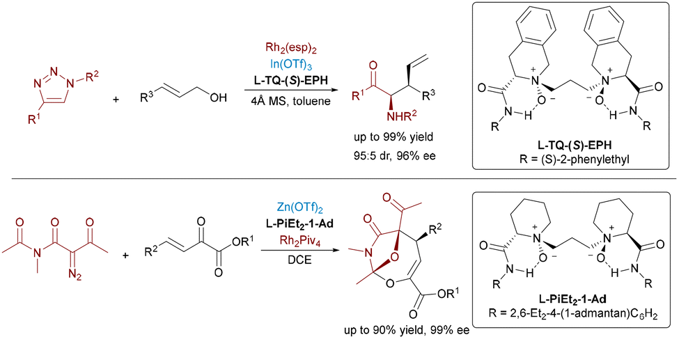 Feng and colleagues pioneered a bimetallic Rh(II)/In(III) relay catalysis, achieving tandem insertion and asymmetric Claisen rearrangement of N-sulfonyl-1,2,3-triazoles with allyl alcohol esters (Scheme 45, top).75 The action between achiral Rh2(esp)2 and chiral N,N′-dioxide-In(III) complexes afforded β,γ-amino acid derivatives in excellent yields and with outstanding stereoselectivities. In addition, Feng et al. developed a Rh(II)/Zn(II) relay catalytic system to facilitate asymmetric [4+3] cycloadditions between β,γ-unsaturated α-ketoesters and diazoimides,76 enabling the synthesis of oxa-bridged oxazocines with high enantioselectivities (Scheme 45, bottom).