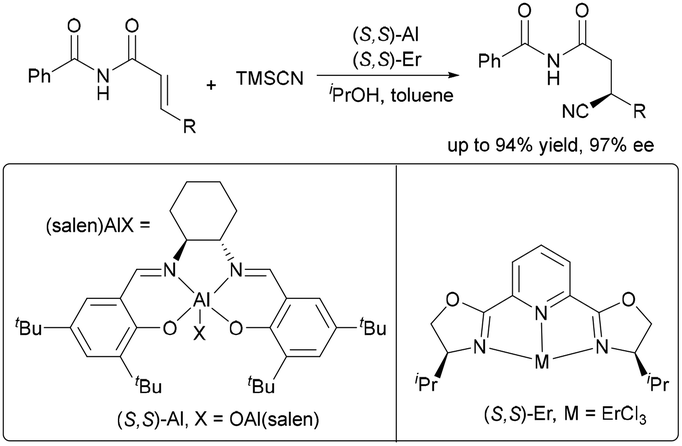 In 1996, the Sawamura and Ito group developed a bimetallic system consisting of a Pd catalyst and a Rh catalyst, coordinated with the same chiral ligand, for the enantioselective allylation of α-cyano esters.5 In 2004, the Jacobson group reported the highly enantioselective conjugate addition of cyanide to unsaturated imides, synergistically catalyzed by a chiral (Salen)Al complex and a chiral (Pybox)Er complex.6 However, it was not until the 2010s that the asymmetric bimetallic catalysis has garnered increasing attention, providing a powerful strategy for the development of asymmetric transformations.7