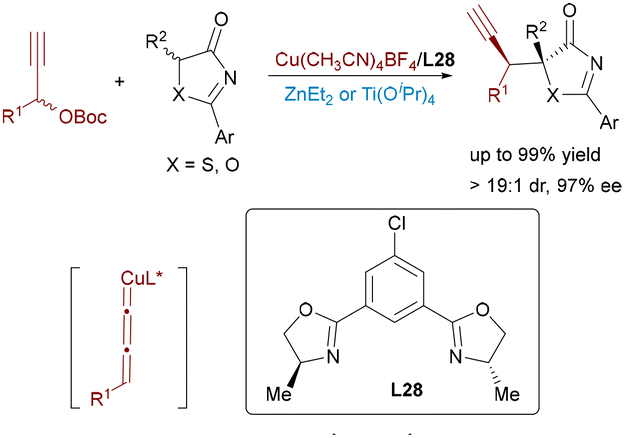 Despite considerable advances in the asymmetric propargyl substitution reaction, the development of copper-catalyzed variants remains underdeveloped. Niu and Zhang completed a highly stereoselective propargylation reaction of 5H-thiazol-4-ones and 5H-oxazol-4-ones using dual metal catalytic systems (Cu/Zn and Cu/Ti) (Scheme 47).77 Chiral copper–allenyl intermediates undergo stereocontrolled coupling with nucleophilic heterocycles, while distinct chiral ligands on each metal precisely guide the formation of vicinal stereocenters, affording products with excellent enantio- and diastereoselectivity.