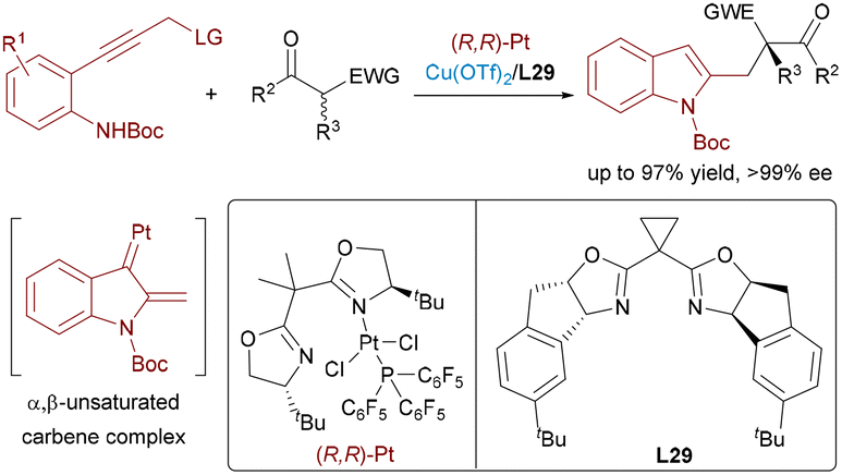 Substituted indoles remain privileged structures in medicinal chemistry and synthesis, featuring prominently in bioactive compounds and serving as versatile synthetic intermediates. Platinum catalysis has emerged as a powerful tool for the efficient construction of indole scaffolds. In 2023, Guo et al. designed an efficient Pt/Cu dual-catalytic system for the asymmetric vinylogous addition reaction (Scheme 48),78 furnishing functionalized indoles with high enantioselectivity. The platinum center activates propargylic ether substrates through electrophilic alkyne coordination, generating α,β-unsaturated carbene intermediates. Meanwhile, the chiral copper complex coordinates with nucleophilic β-dicarbonyl compounds to form enolate species. The stereoselective nucleophilic addition to the platinum-carbene intermediate governs the formation of enantioenriched products.