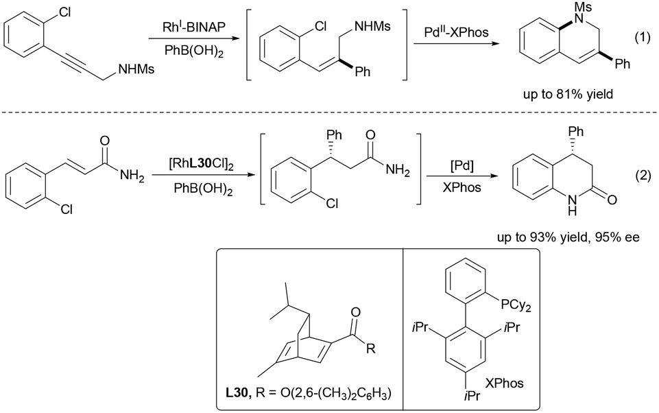 Building upon the foundational principles of dual transition-metal catalysis, early advancements such as the Rh/Pd-catalyzed domino alkyne arylation/C–N cyclization reported by Lautens and coworkers in 2011 demonstrated the feasibility of combining orthogonal catalytic cycles for achiral dihydroquinoline synthesis (Scheme 49, eqn (1)).79a However, a pivotal breakthrough in achieving high enantioselectivity within such bimetallic systems emerged in 2014 with the development of an enantioselective variant (eqn (2)).79b This seminal work elegantly addressed the critical challenges inherent to its predecessor—specifically, the need for stereocontrol—by introducing a chiral diene ligand for the rhodium-catalyzed asymmetric conjugate arylation step. This chiral Rh complex was then paired with a palladium/XPhos system responsible for the subsequent intramolecular C–N coupling. The resulting sophisticated “two-catalyst-two-ligand” strategy achieved exceptional enantioselectivity (up to 95% ee) and high yields (93%) in the synthesis of dihydroquinolinones, exemplifying the power of ligand orthogonality and kinetic resolution within a dual-metal framework. Crucial to this success was the meticulous design ensuring compatibility: the selective coordination of the diene ligand to Rh enabled precise stereochemical induction without disrupting the Pd catalytic cycle, while the robust XPhos/Pd interaction effectively suppressed ligand crossover. Furthermore, the temporal separation of catalytic steps—rapid Rh-mediated arylation followed by slower Pd-driven cyclization—minimized interference from competing pathways, such as undesired Suzuki coupling involving the arylboronic acid and aryl bromide components. This landmark study provided a modular blueprint for designing effective dual transition-metal systems that integrate chiral and achiral ligands selectively.