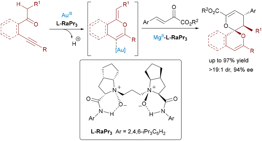 In 2019, Feng and colleagues extended the dual Lewis acid strategy to the synthesis of enantiomerically enriched 6,6-spiroketals using a relay Au(III)/Mg(II) system (Scheme 4).15 The reaction combined β-alkynyl ketones with β,γ-unsaturated α-ketoesters through a tandem cycloisomerization/inverse-electron-demand [4+2] cycloaddition. The achiral Au(III) catalyzed the initial 6-endo-dig oxo-cyclization to form a carbonyl ylide intermediate, while the chiral N,N′-dioxide–Mg(II) complex orchestrated the enantioselective [4+2] cycloaddition. Mechanistic studies revealed the critical role of the Feng ligand as a base, facilitating deprotonation to generate a reactive gold-bound alkene intermediate for stereocontrolled cyclization.