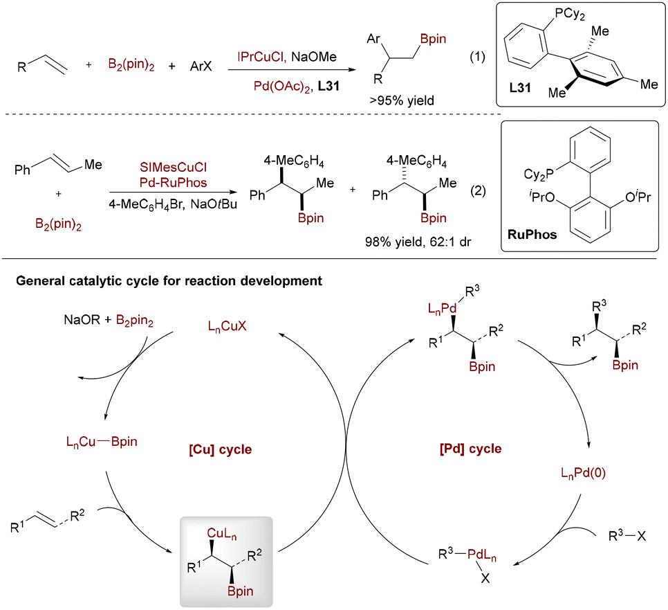 The foundation for Pd/Cu synergistic arylboration was established by the seminal, independent reports from Nakao and Brown in 2014, which demonstrated the arylboration of vinylarenes using aryl halides and B2(pin)2 (Scheme 50, eqn (1)).80b In this pioneering system, copper catalysis activates B2(pin)2 to generate a reactive NHC-Cu–Bpin species (NHC = N-heterocyclic carbene), enabling syn-borylcupration across the vinylarene to form a stable β-borylbenzylcopper intermediate. Palladium catalysis then facilitates oxidative addition of the aryl halide, transmetalation with the Cu-bound alkyl group, and reductive elimination to yield 1,2-diarylethylboronates with good regioselectivity and functional group tolerance. This breakthrough highlighted the potential of integrating Cu-mediated borylation with Pd-catalyzed cross-coupling in a dual transition-metal system.