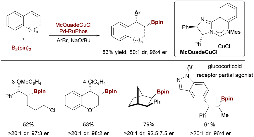 6 er) was realized with McQuadeCuCl, showcasing modular access to stereodefined alicyclic architectures. Copper/palladium synergistic catalysis enables enantioselective arylboration across diverse alkene substrates—including styrenes, internal alkenes, enynes, and dienes—delivering multifunctional chiral organoboron building blocks with high stereocontrol.