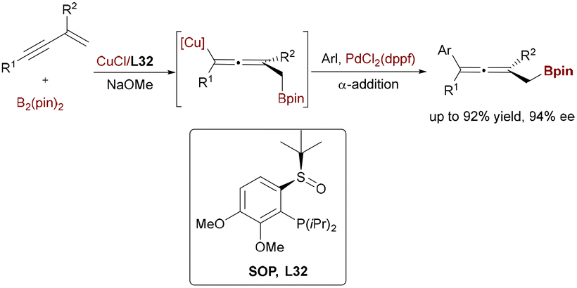 | Scheme 52 Cu/Pd-catalyzed enantioselective arylboration of 1,3-enynes for the synthesis of axially chiral allenes. | ||