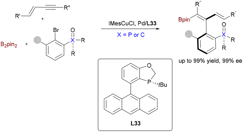 | Scheme 53 Cu/Pd-catalyzed enantioselective arylboration of 1-substituted enynes for the synthesis of axially chiral 1,3-dienylboronates. | ||