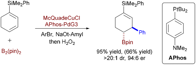 Expanding beyond enynes, Brown and coworkers demonstrated Cu/Pd-catalyzed arylboration of 1-silyl-1,3-cyclohexadienes (Scheme 54).82 Using a sterically demanding Mes-Pyridylidene ligand, this method achieved high trans-diastereoselectivity (>20