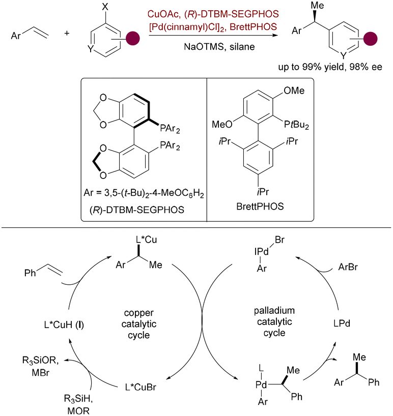 Buchwald and colleagues pioneered the first asymmetric CuH/Pd-catalyzed hydroarylation of vinylarenes (Scheme 56),84 diverging fundamentally from prior Cu-boryl strategies. Here, a chiral CuH species (generated from DTBM-SEGPHOS/Cu/silane) enantioselectively hydrocuprates styrenes to form benzylic-Cu intermediates, which undergo stereoretentive transmetalation with Pd–Ar complexes (from aryl bromide oxidative addition) and reductive elimination to deliver 1,1-diarylalkanes. This silane-driven hydrometallation mechanism replaces B2pin2-dependent borylcupration and avoids boronate byproducts, enabling up to 96% ee for β-substituted styrenes and heteroaryl bromides. It thus provides direct access to pharmaceutical scaffolds through an orthogonal, boron-free pathway.