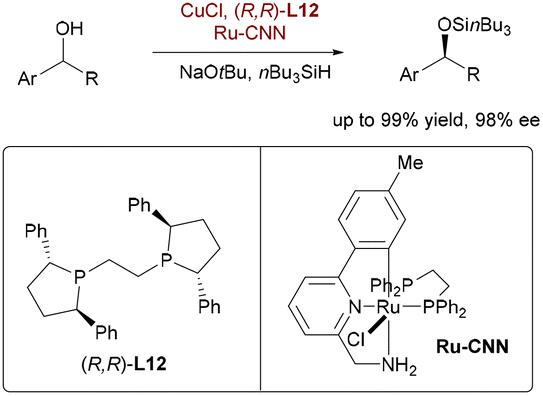 Parallelly, leveraging orthogonal bimetallic catalysis for alcohol functionalization, Oestreich and co-workers pioneered the first non-enzymatic dynamic kinetic resolution (DKR) enabling enantioselective silylation of racemic alcohols (Scheme 57).85 This strategy synergistically combines rapid alcohol racemization, catalyzed by a bifunctional ruthenium pincer complex, with an enantioselective dehydrogenative Si–O coupling mediated by a Cu–H catalyst system using nBu3SiH. Critically, the ruthenium catalyst enables efficient substrate racemization without promoting deleterious background reactions like silyl ether racemization or unselective coupling – challenges that incapacitated conventional ruthenium half-sandwich complexes. This orthogonal catalyst pairing delivered various acyclic and cyclic benzylic silyl ethers in near-quantitative yields and high enantioselectivity (up to 98% ee), providing efficient access to pharmaceutical precursors like duloxetine and rivastigmine, thereby demonstrating the power of orthogonal bimetallic design for complex chiral synthesis beyond alkene functionalization.