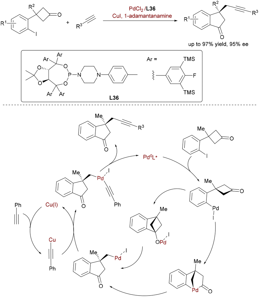 Diverging from carbonyl umpolung strategies, Xu and co-workers achieved enantioselective C(sp3)–C(sp) alkynylation via synergistic Pd/Cu-catalyzed C–C σ-bond activation/Sonogashira coupling (Scheme 59).87 This innovative tandem process involves Pd0-mediated oxidative addition into cyclobutanones' C(sp2)–C(sp3) bonds, followed by β-carbon elimination to generate σ-alkylpalladium species. Subsequent stereoselective transmetalation with copper acetylides (formed in situ from terminal alkynes and CuI) and reductive elimination yield chiral alkynylated indanones bearing all-carbon quaternary stereocenters (up to 97.5